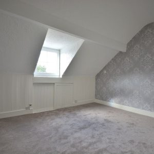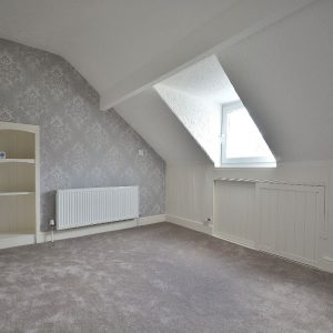 A generous attic room with a radiator, ceiling lighting, internally built storage cupboard and a double glazed window to the front elevation.