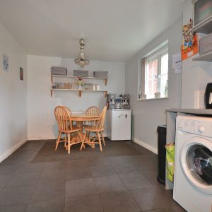 A well proportioned kitchen diner fitted with a range of wall cupboards, base units and drawers with working surfaces over. Inset sink with drainer and mixer tap, integrated oven, four ring gas hob, extractor hood over, plumbing for washing machine and space for a fridge. There is also ceiling lighting, radiator and a double glazed window.