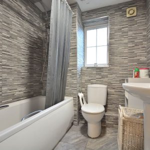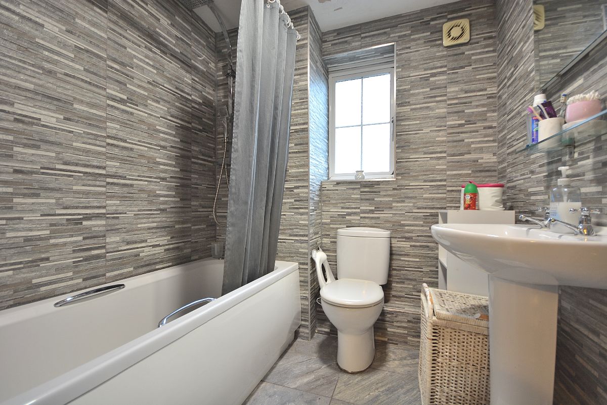 A modern fully tiled bathroom with three piece suite comprising a panelled bath with internally plumbed shower over, wash hand basin and a low flush WC. There is also a radiator, ceiling lighting and an obscure double glazed window.