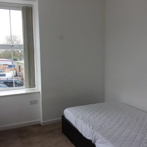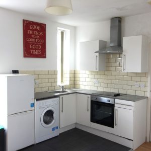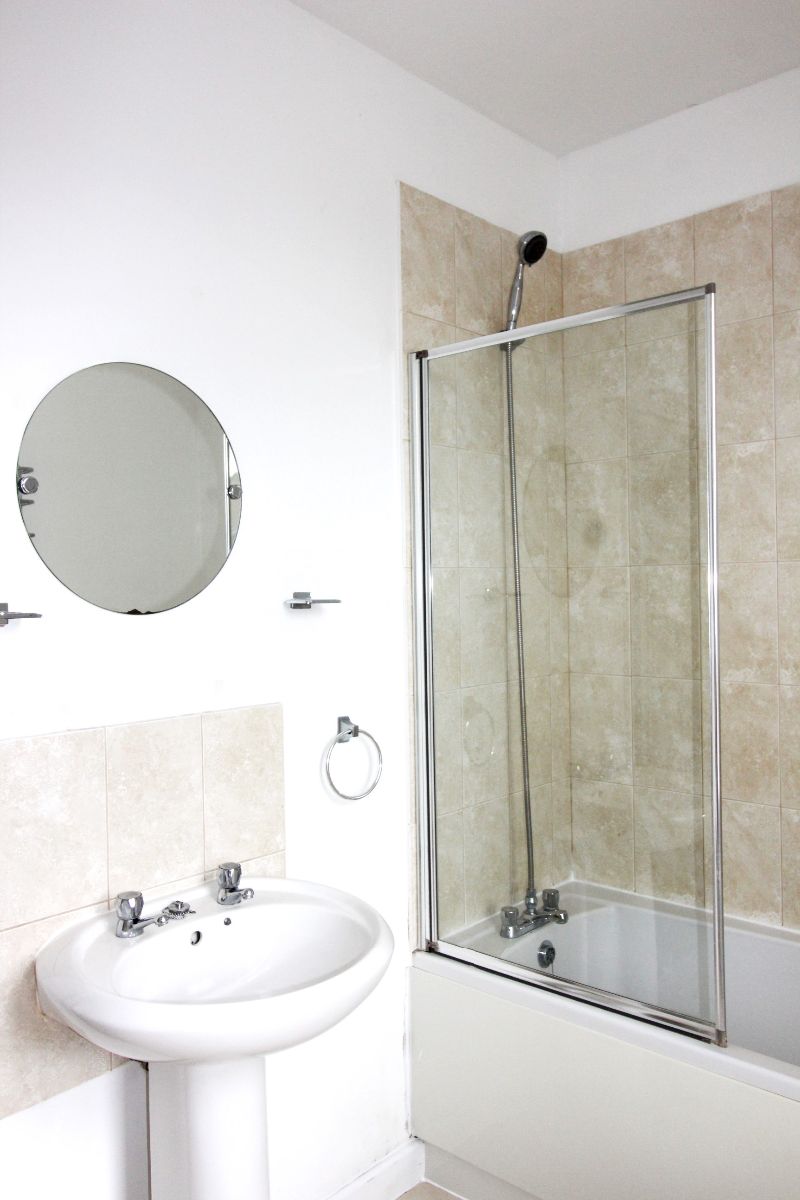 Inside, the apartment features a bright open-plan living and kitchen area with integrated appliances, two generously sized double bedrooms, and a modern bathroom fitted with a three-piece suite comprising a bath with overhead shower, washbasin, and WC.