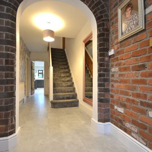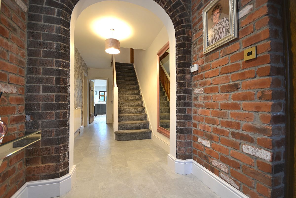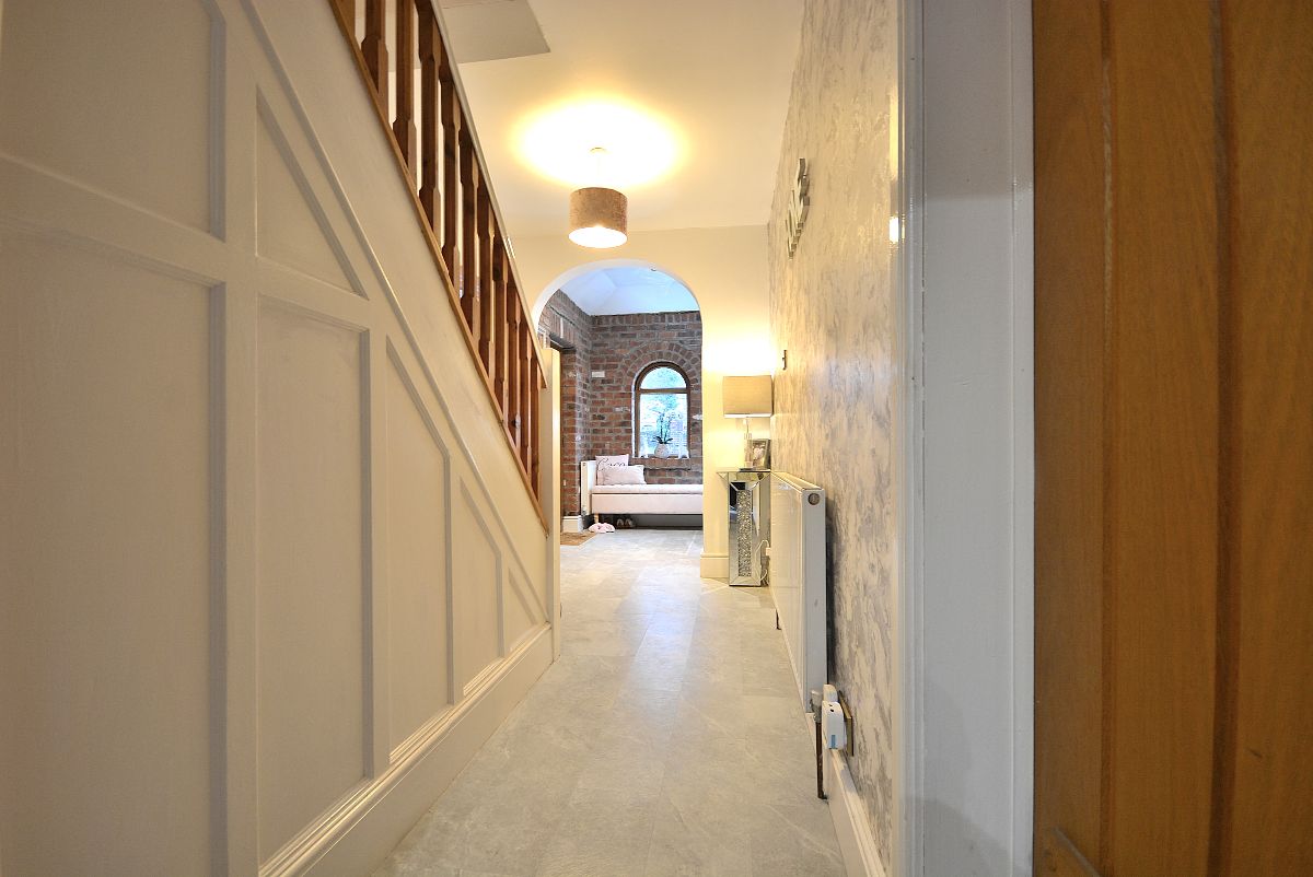 A large entrance hall running open plan off the initial entrance porch with ceiling lighting, radiator and stairs rising to the first floor landing.