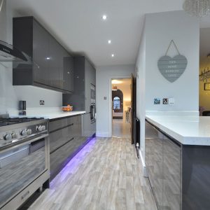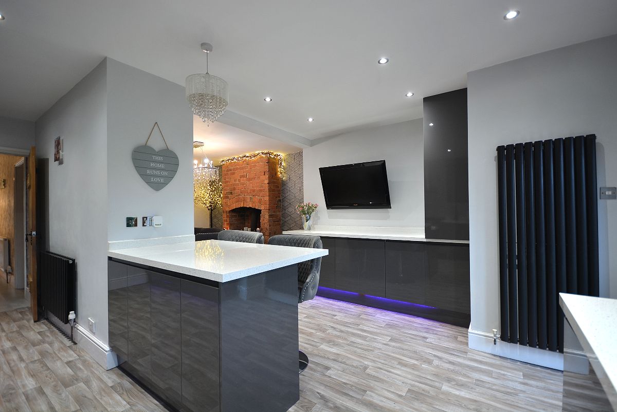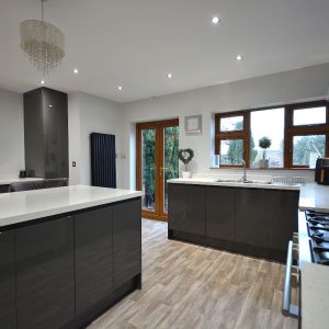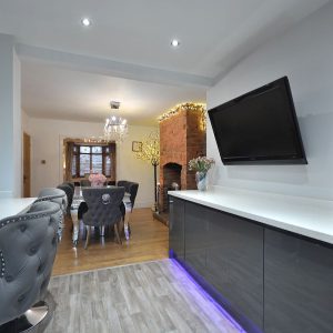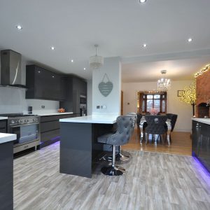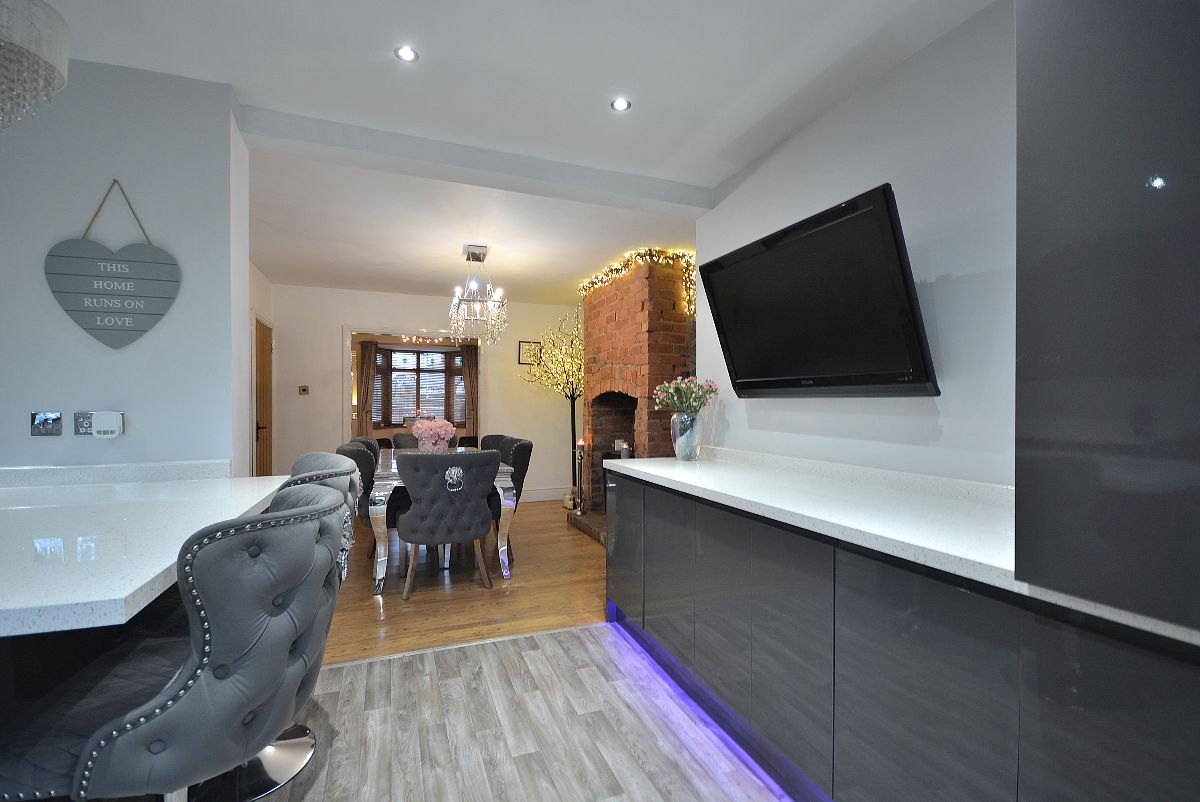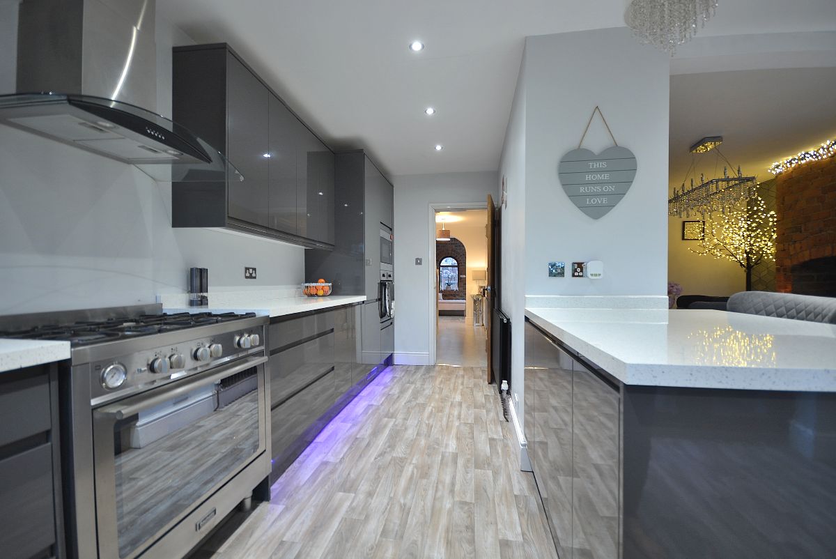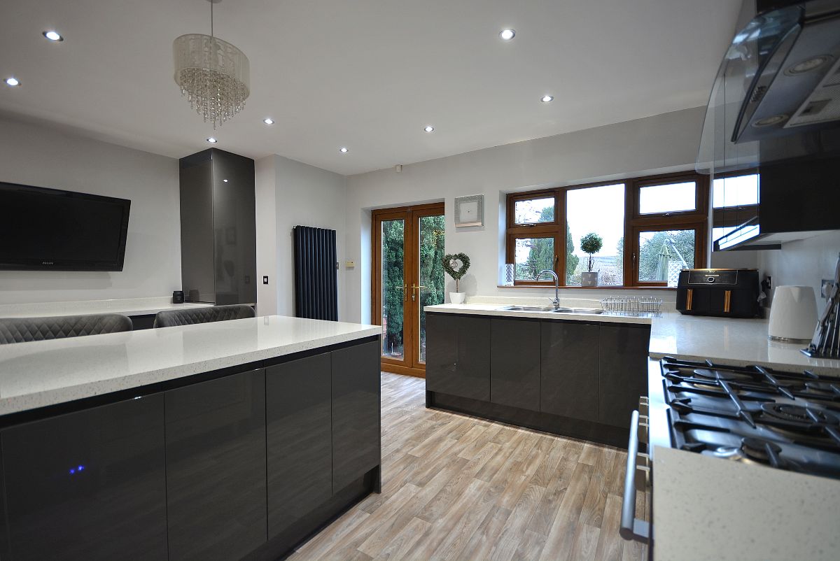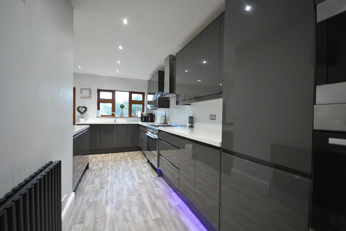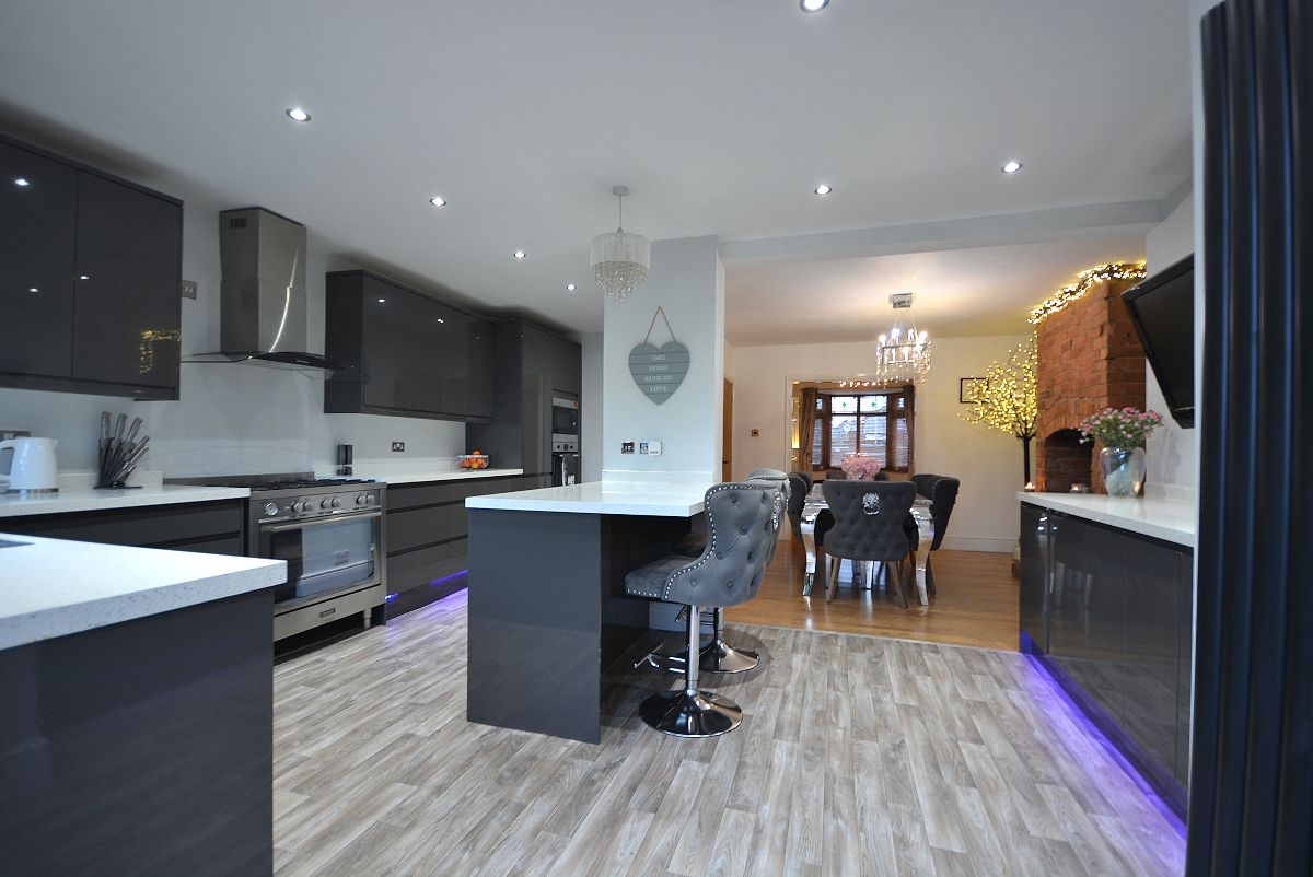 A magnificent, immaculate kitchen fully fitted with an extensive range of fitted wall cupboards, base units and drawers with granite effect working surfaces over. Inset sink with drainer and chrome mixer tap. Integrated oven and microwave, additional range style Stoves cooker with five ring burner and wall mounted extractor hood over. There is also an integrated washing machine and fridge/freezer. There is also a full height contemporary radiator, array of LED ceiling spotlights, LED kickboard lighting, double glazed window and French doors opening into the rear garden and open plan access straight into the:
