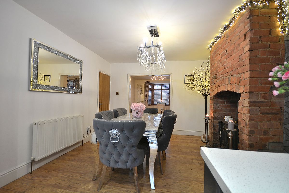 A spacious dining room with stunning feature exposed brick fireplace with large opening with inset log burner, ceiling lighting, radiator and another open plan opening into the: