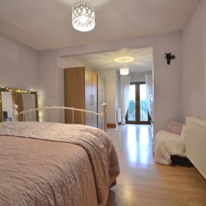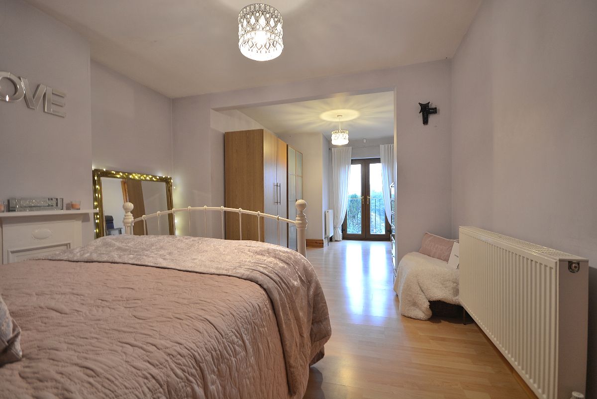 A huge 23ft master bedroom with ceiling lighting, radiators and double glazed French doors opening onto a Juliette balcony with a wonderful outlook over the large private rear garden.
