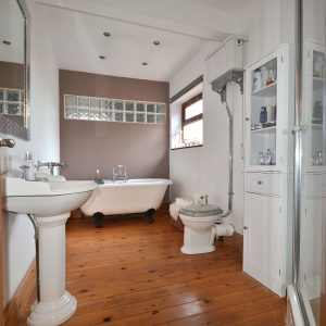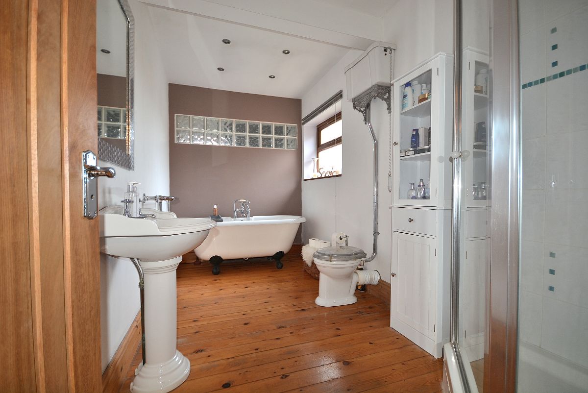 A large four piece family bathroom with a free standing bath, shower enclosure, wash hand basin and a low flush WC. There is also ceiling lighting, radiator and a double glazed window to the rear elevation.