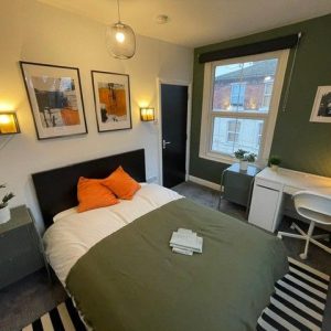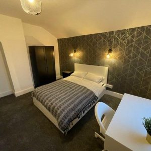 Each bedroom is furnished with a double bed, bedside table, wardrobe, drawers, desk, and chair, offering plenty of space for rest and organisation.
