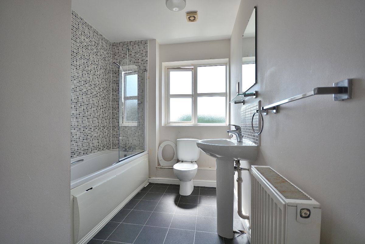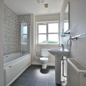 A well proportioned bathroom with fitted three piece suite comprising a panelled bath with shower over, wash hand basin and a low flush WC. There is also a radiator, ceiling light point and an obscure double glazed window to the front elevation.