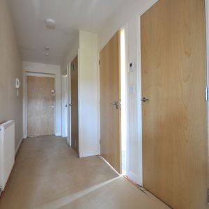 A central entrance hall with a radiator, hand storage cupboard and ceiling lighting.