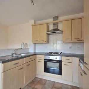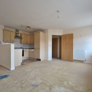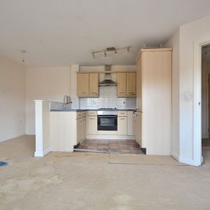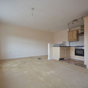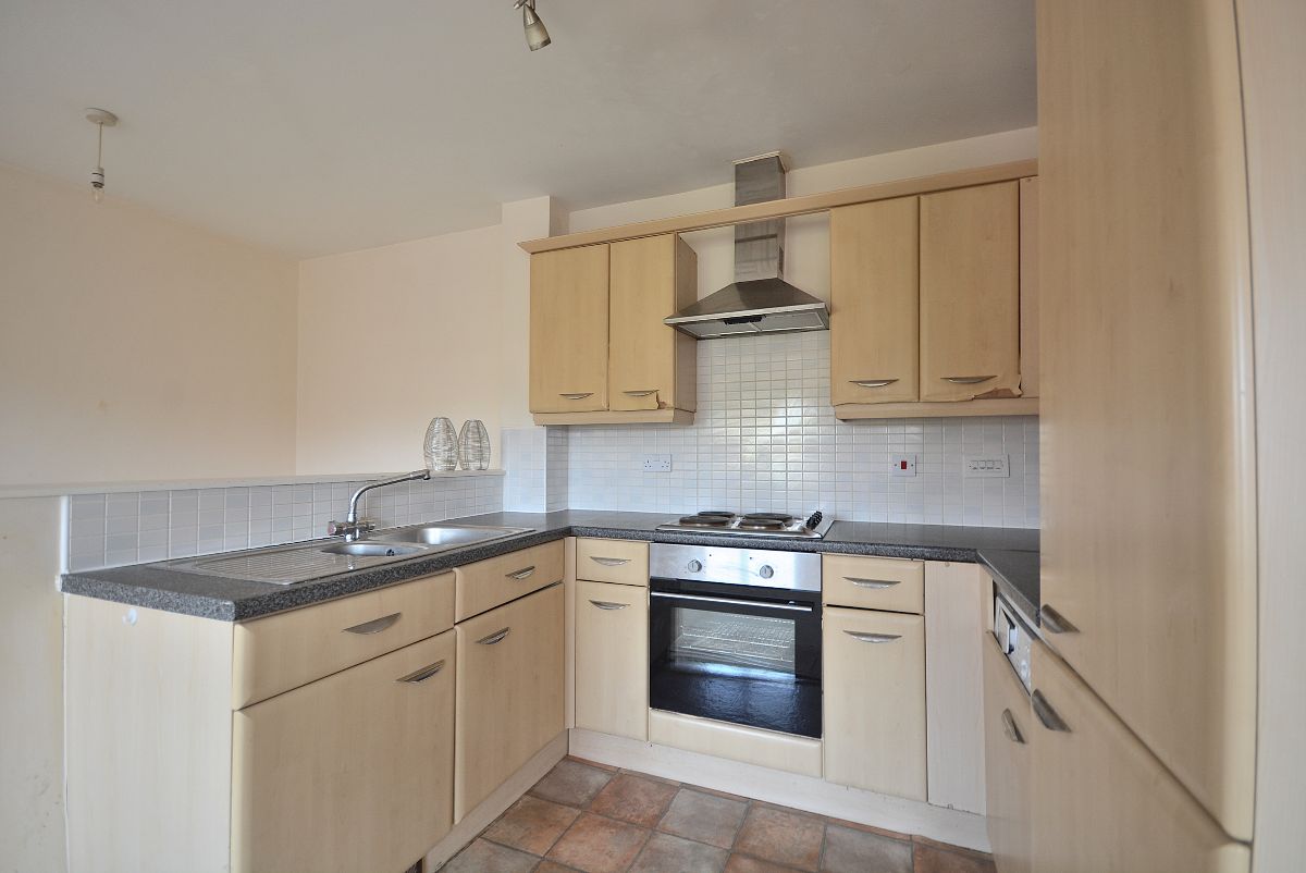 A spacious living area with a clearly defined living and kitchen area. The kitchen area has fitted wall cupboards, base units and drawers with working surfaces over. Inset sink with drainer and mixer tap. Integrated oven, four ring electric hob with wall mounted stainless steel extractor hood over. There is also plumbing for a washing machine, fridge/freezer, ceiling light point and a double glazed windows to the side elevation.