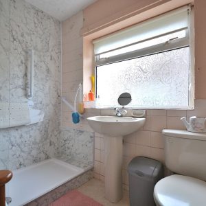 With three piece suite comprising a walk in shower with wall mounted shower, wash hand basin and a low flush WC. There is also a radiator, ceiling lighting and an obscure double glazed window to the side elevation.