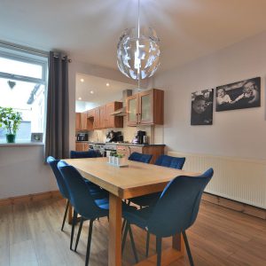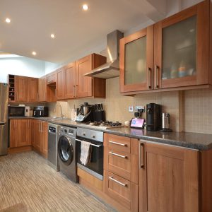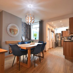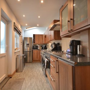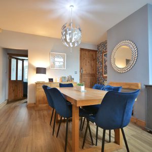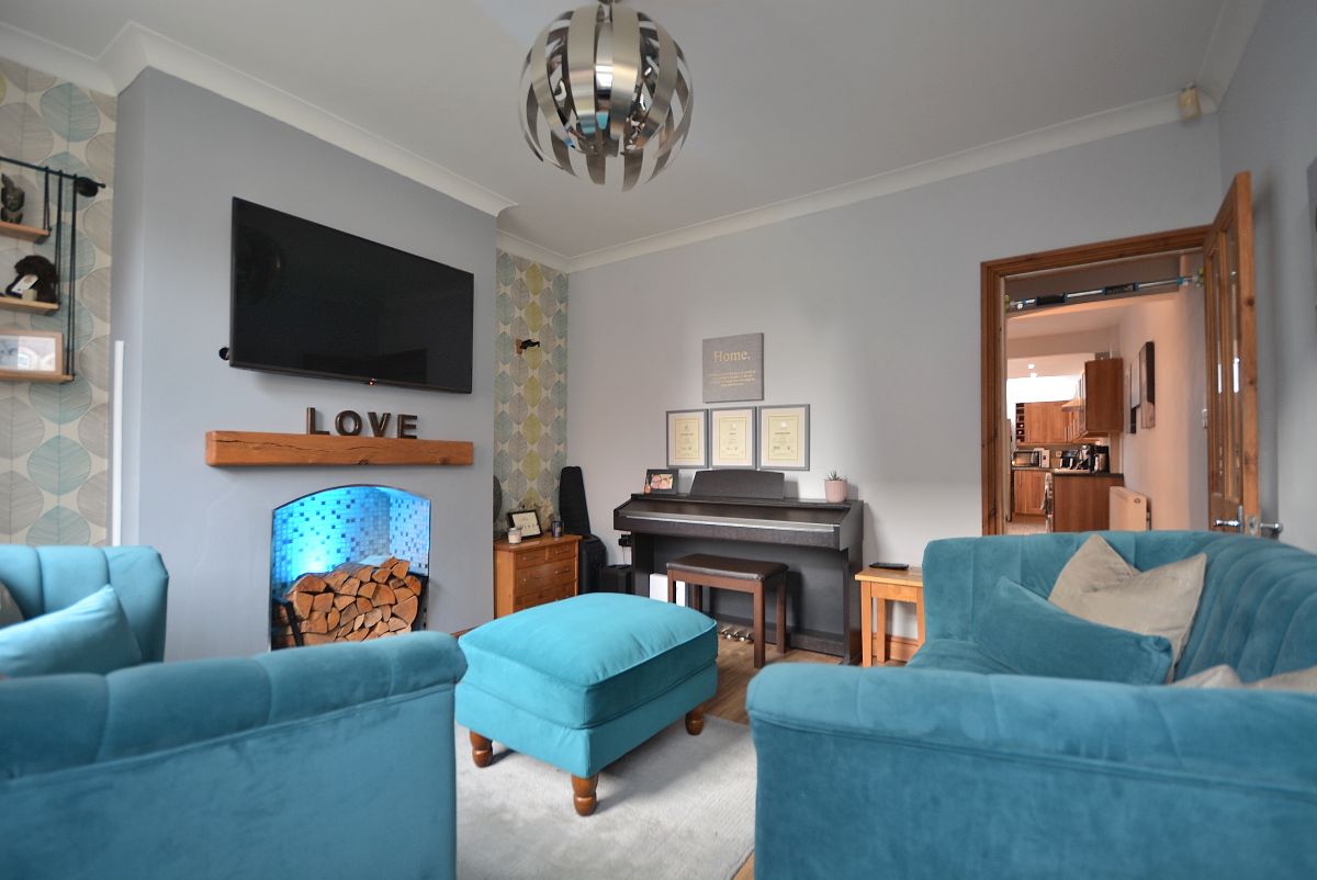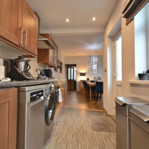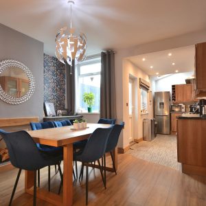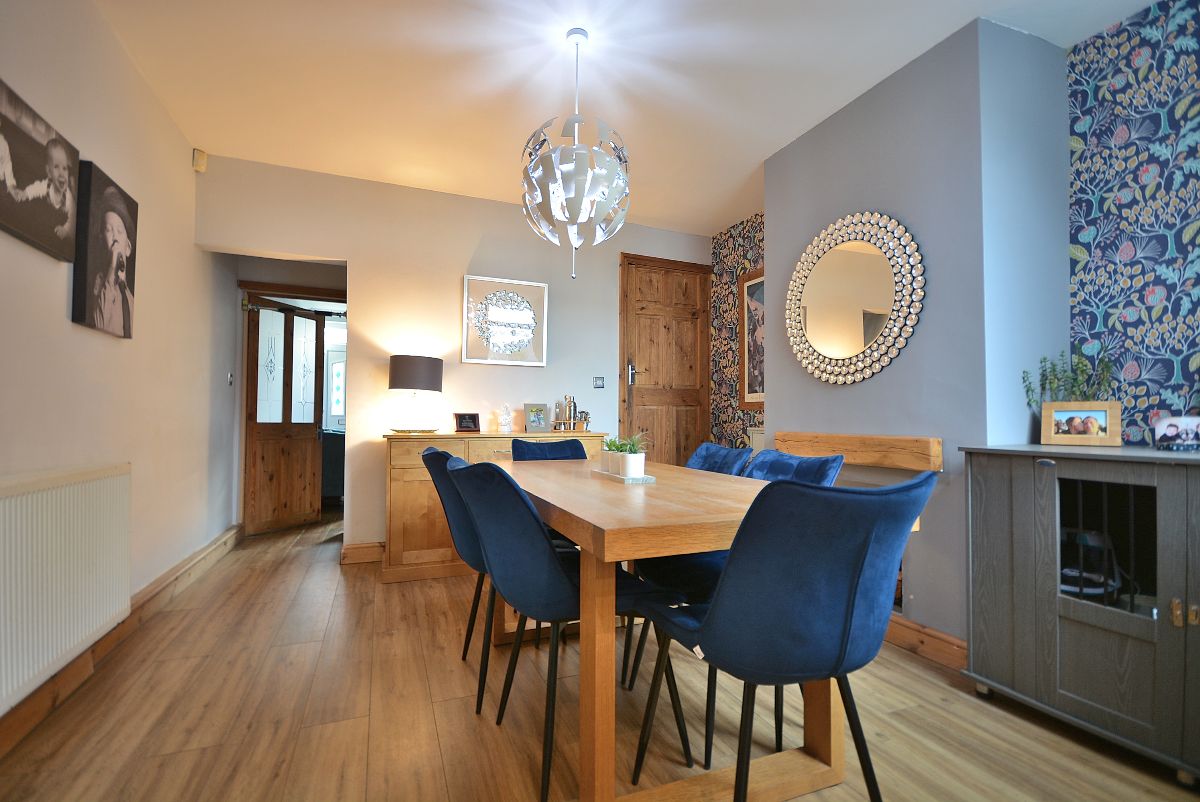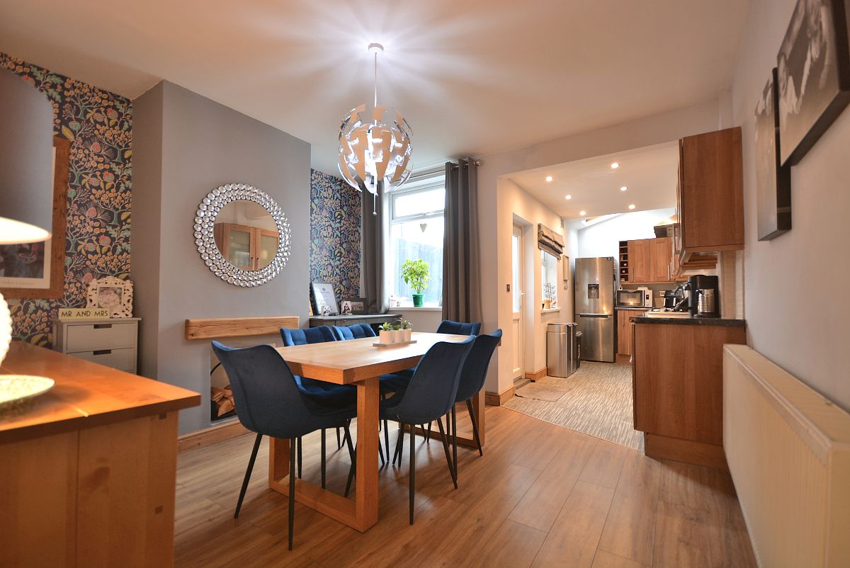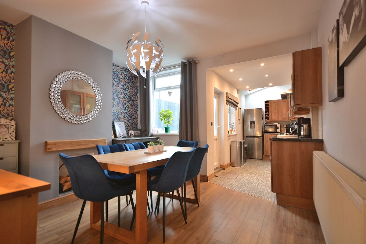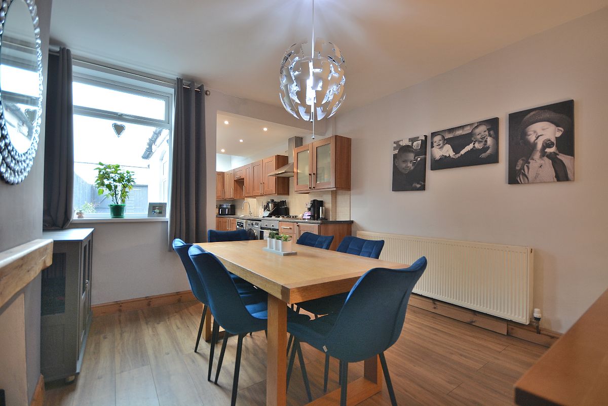 A fantastically sized open plan dining kitchen which has been opened into the extended kitchen area making it a fabulous versatile room for all the family. Having a fully fitted shaker style kitchen area with wall cupboards, base units and drawers with working surfaces over, inset stainless steel sink with drainer and mixer tap, integrated oven, four ring gas hob with wall mounted extractor hood over, plumbing for a washing machine and dishwasher and space for a free standing fridge freezer. There is also a spacious dining area/living area with access door into the cellar which offers up possibility for conversion. There is also an access door to the stairs and double glazed windows and door opening onto the private rear garden.
