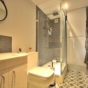 A beautifully appointed, sleek & stylish shower room having a double width shower enclosure with wall mounted internally plumbed chrome drencher shower, wash hand basin with inset high gloss storage beneath and chrome mixer tap and a low flush WC. There is also a contemporary matte anthracite heated towel radiator, sensor LED ceiling spotlights, high gloss storage cupboard housing the boiler and an extractor fan.