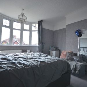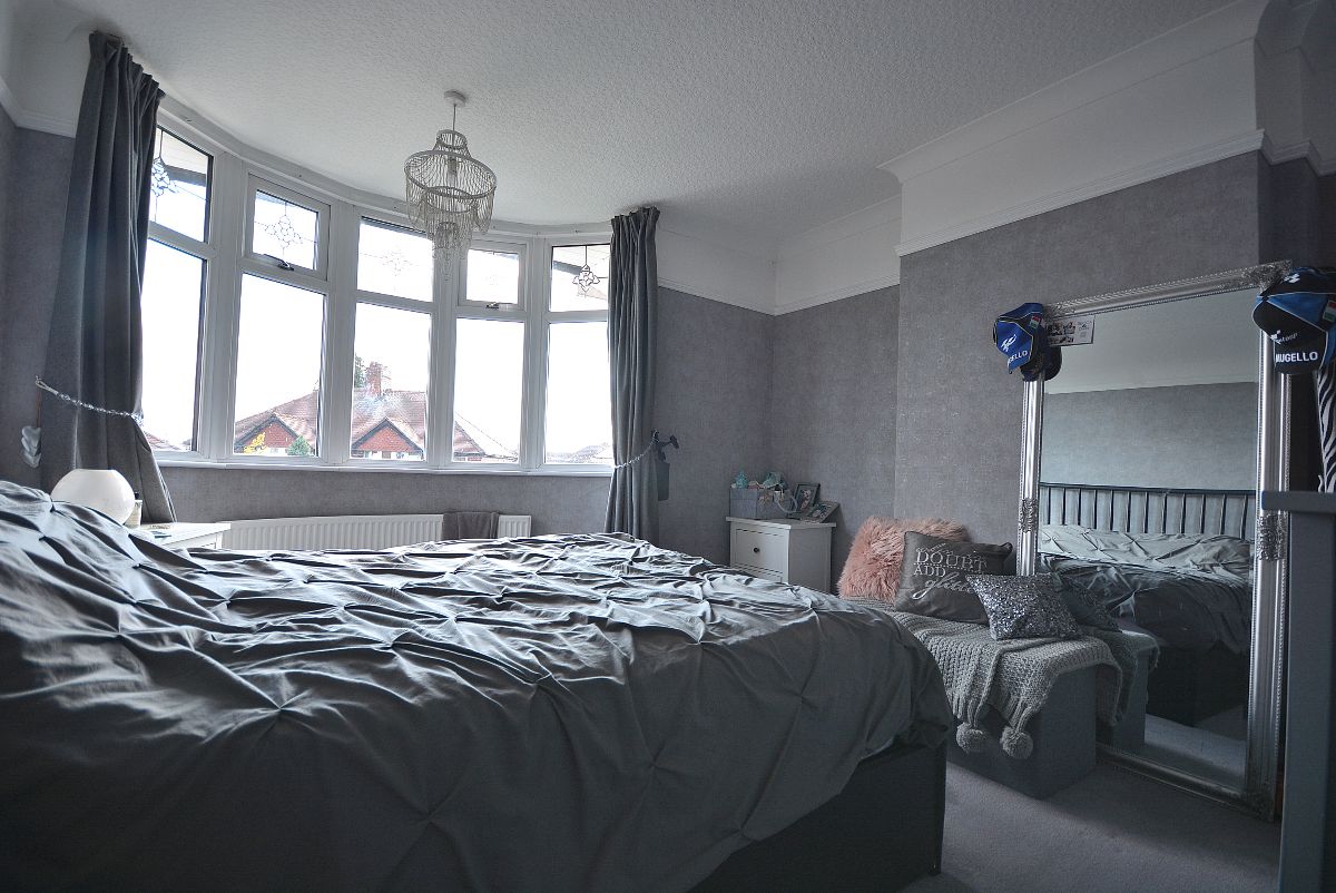 A bay fronted bedroom with a radiator, ceiling lighting and a double glazed bay window to the front elevation.