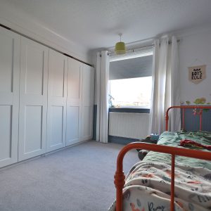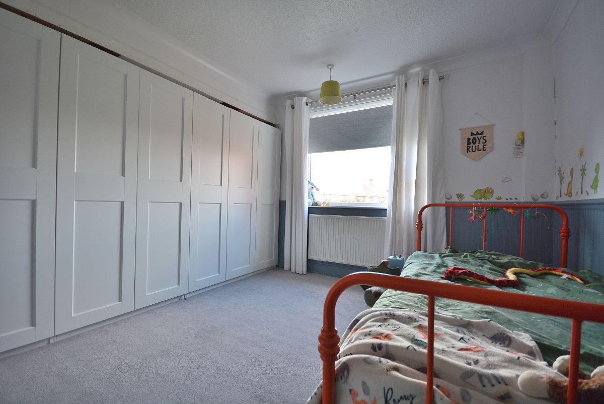 A second spacious bedroom with a fitted wardrobes with inset hanging rails and shelving. There is also a radiator, ceiling light point and a double glazed window to the rear elevation.