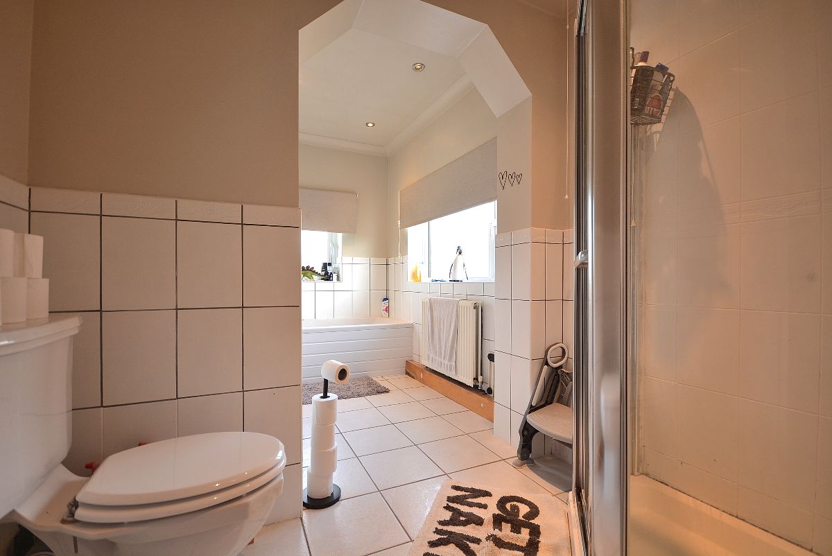 An extended family bathroom with four piece suite comprising a shower enclosure with wall mounted shower, panelled bath, wash hand basin with mixer tap and a low flush WC. There is also a radiator, ceiling lighting and double glazed obscure windows to the rear elevation.