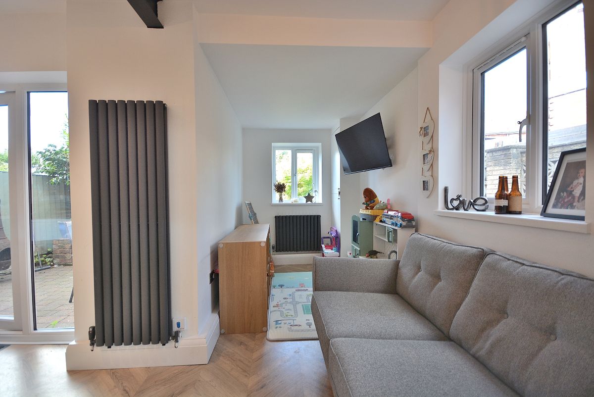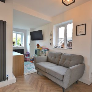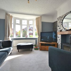 A bay fronted living room with central feature fireplace with inset log burner. There is also a radiator, ceiling lighting, large double glazed bay window to the front elevation and internal double doors opening into the living kitchen.